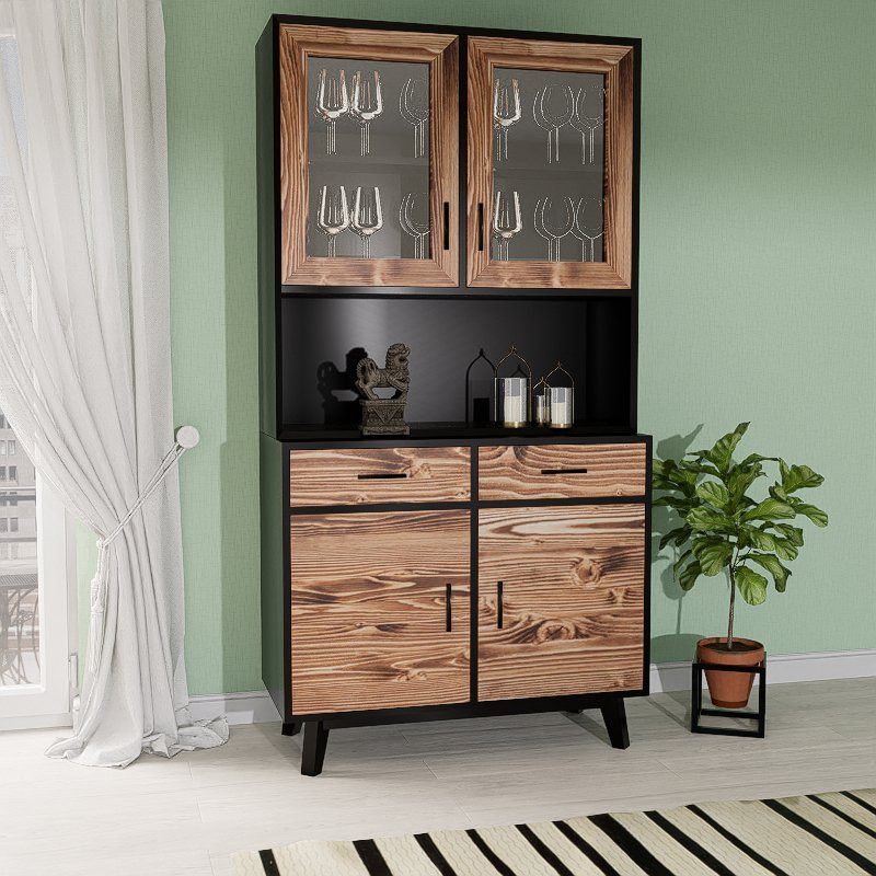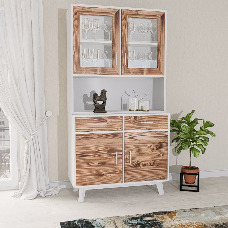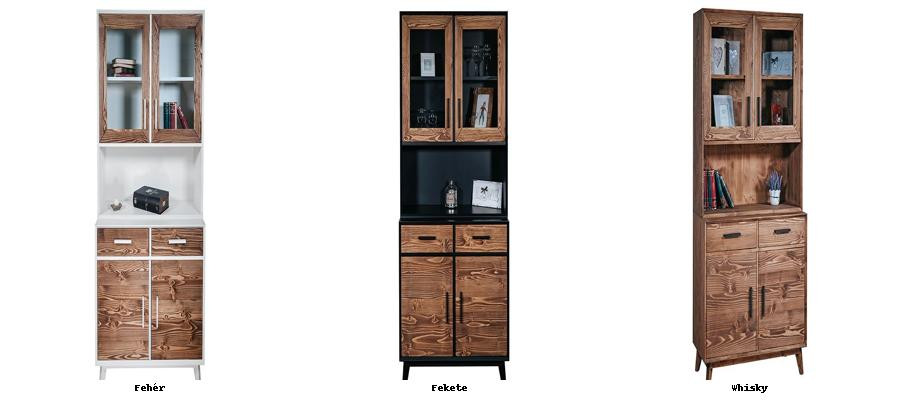 Az alsó rész kétajtós szekrényében és két tágas fókjában terítők, eszközök, dokumentumok vagy egyéb hasznos tárgyak kaphatnak helyet, míg a felső vitrines rész polcain a dísz- és használati tárgyak stílusosan elrendezhetők.