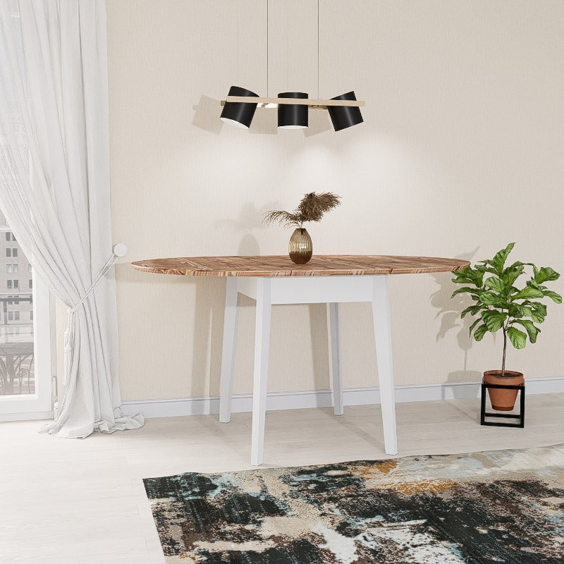 Ez a bővíthető kerek asztal ideális választás kisebb étkezőkbe, ahol a hétköznapokban kompakt megoldásra van szükség, ugyanakkor időnként több férőhelyre. Praktikus kialakítása, természetes anyaghasználata és időtálló kivitele révén harmonikus kiegészítője lehet bármely enteriőrnek.